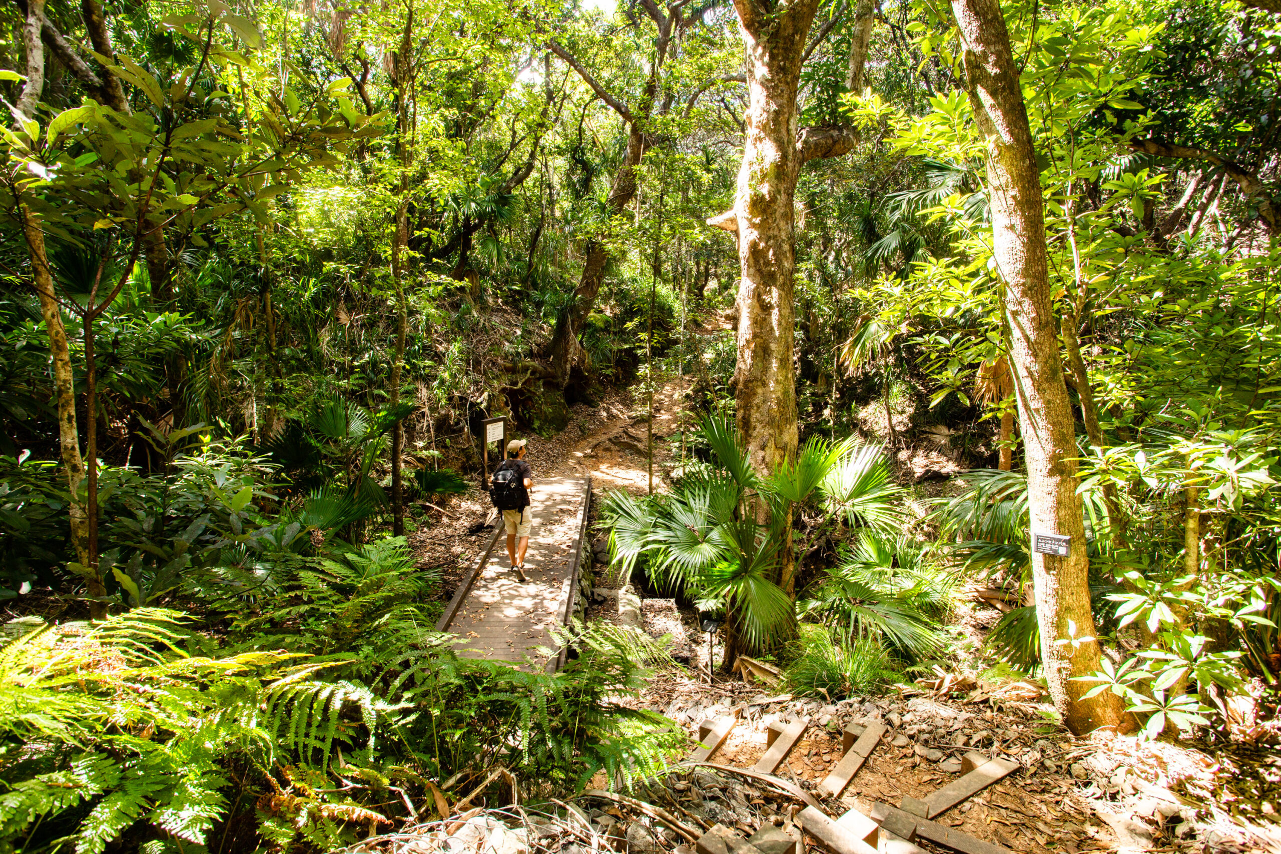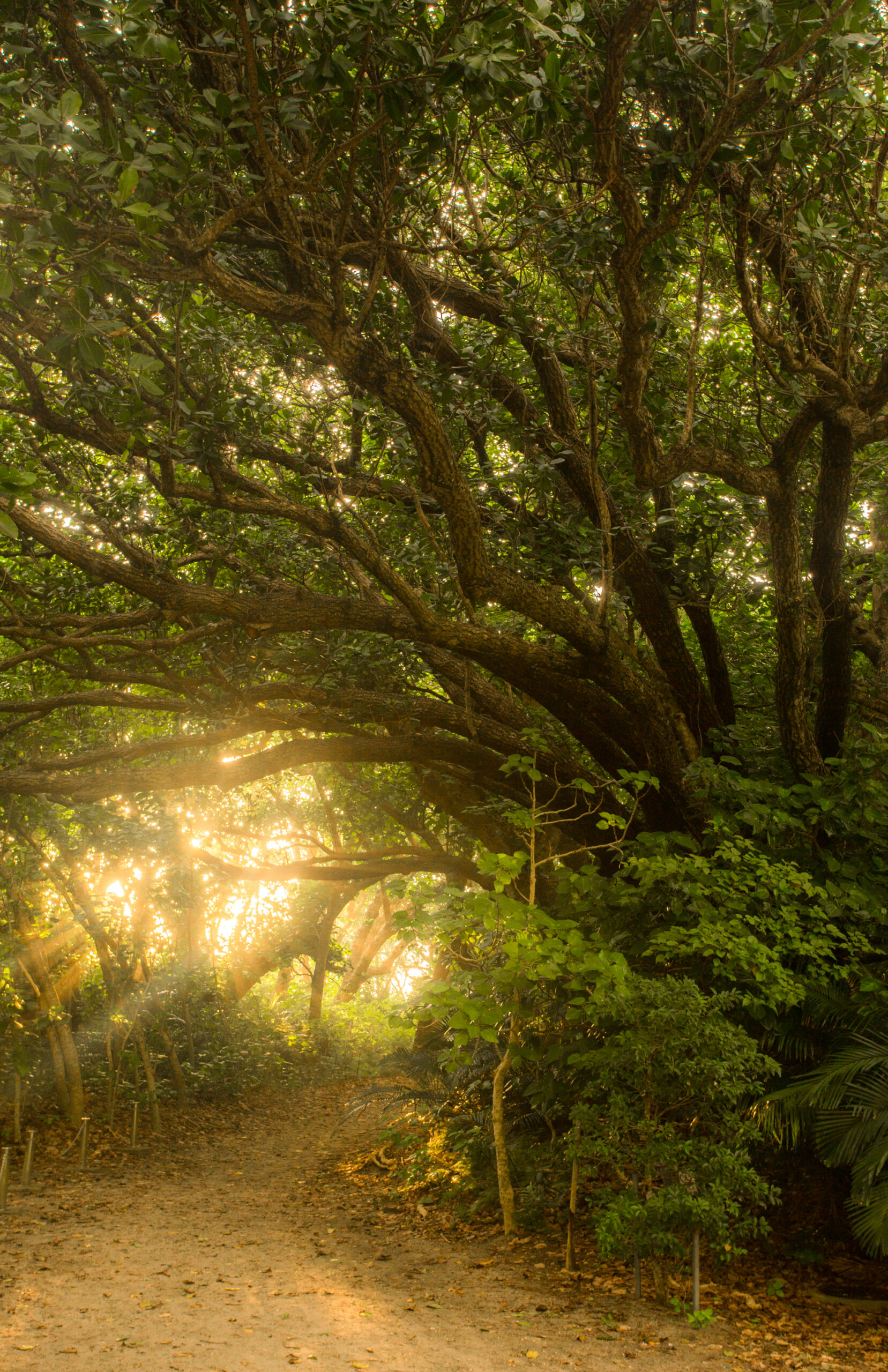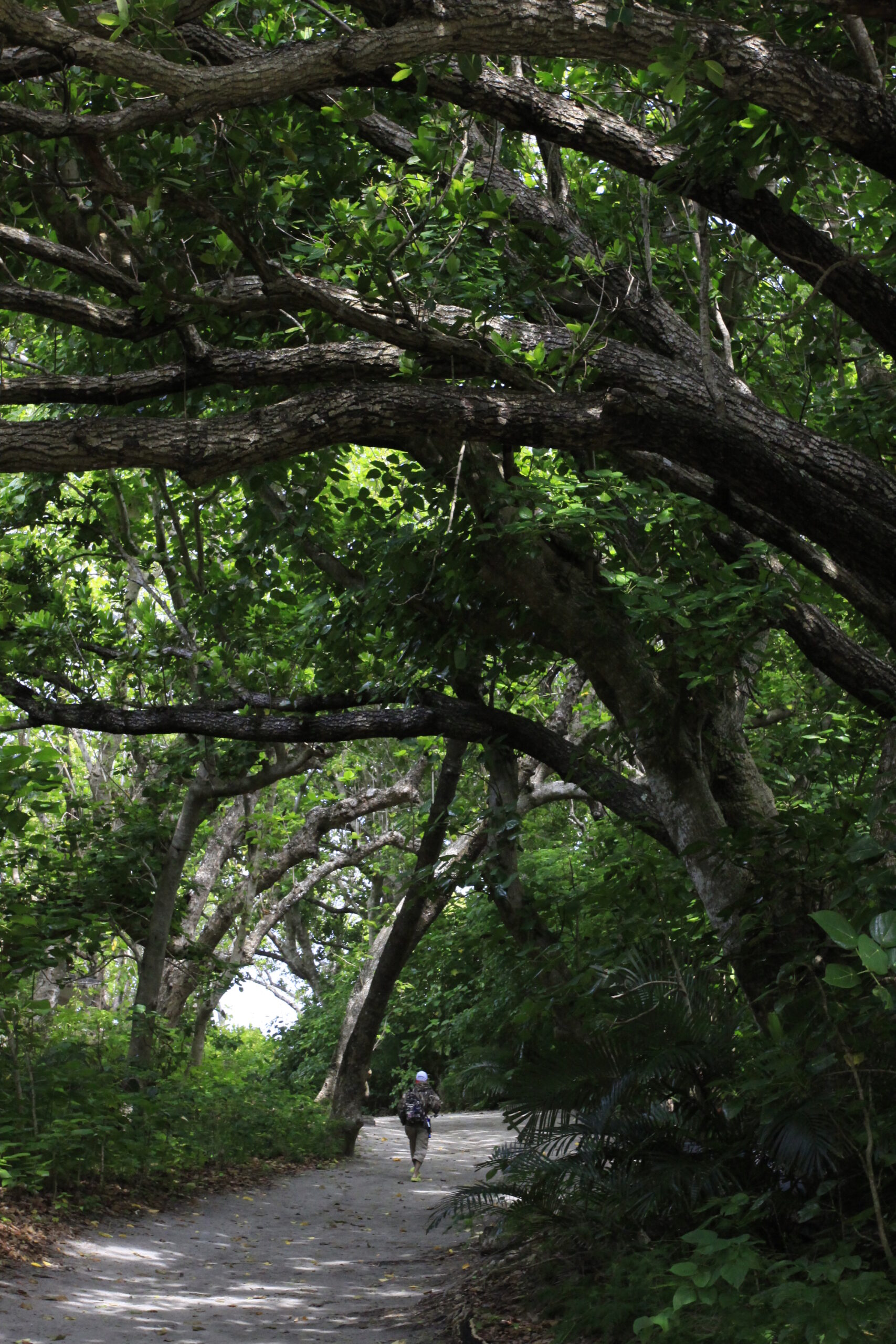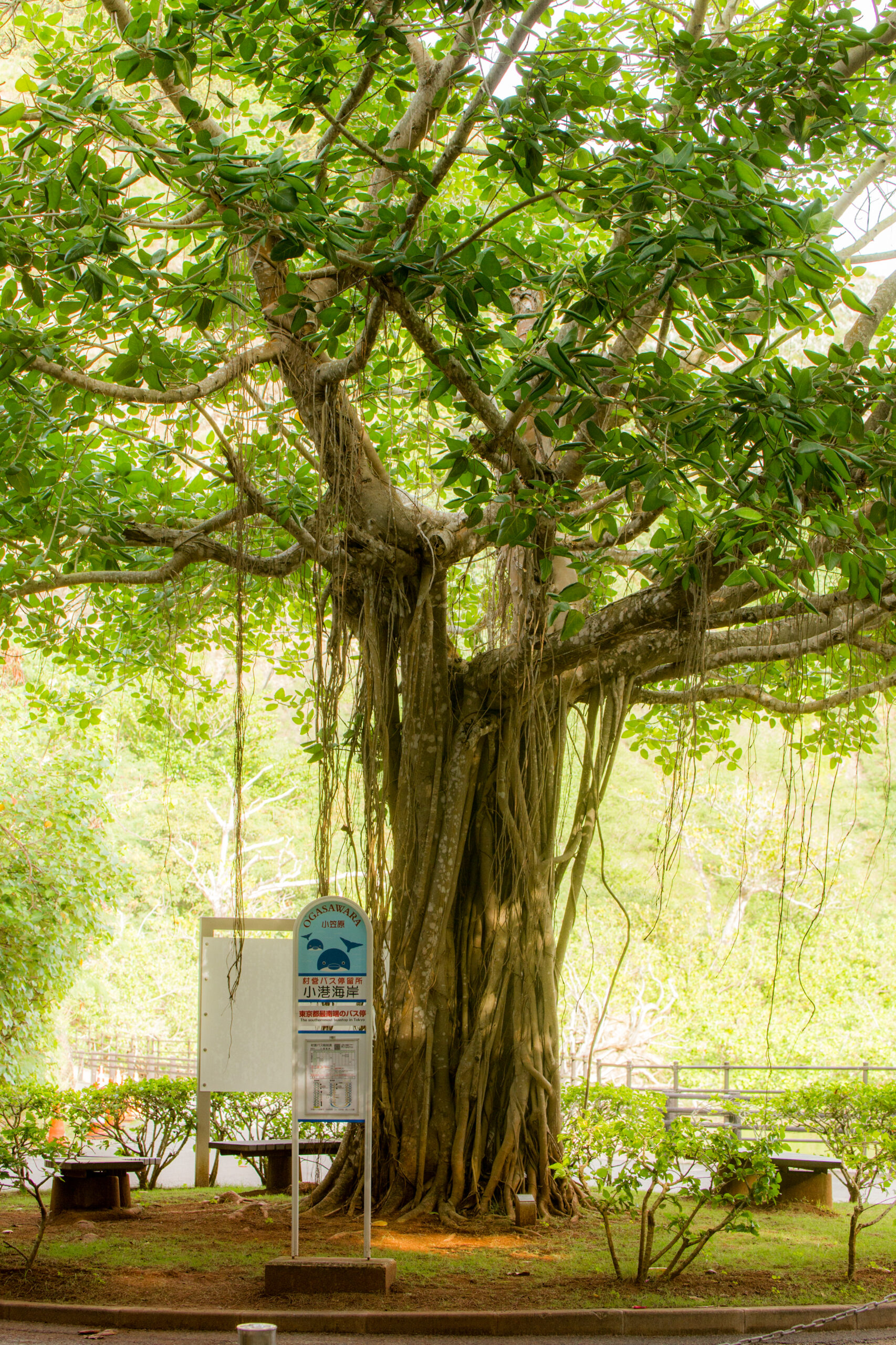 バス停の看板には不思議な顔のクジラさんとともに「東京都最南端のバス停」と書かれていて、ベンガルボダイジュという独特の雰囲気を醸す木がバス停とともにロータリーに立っており、すでにここだけでもフォトジェニック♪ しかしそこから先もなかなかのに情緒溢れる風景で、海岸に向かう遊歩道に入るとタマナ(テリハボク)やモモタマナ、ハスノハギリといった南方由来の巨木が作り上げる海岸林がお出迎え。もう既にこの海岸林に入ったっだけで「どこだここ?」っていう感覚になると思いますよ。