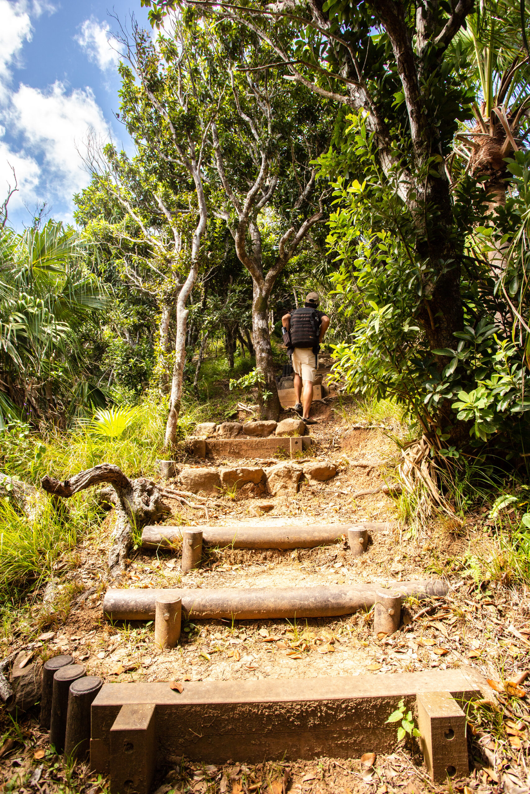 大村の集落からも比較的間近に見える旭山は、ガイド付きでなくても歩ける遊歩道を歩けますが、舗装はほとんどされていない山道です。ところどころ階段が設けられて比較的歩きやすいですが、一方で急な勾配もありますので、それなりに歩ける服装と靴が必要。特に雨上がりは赤土がぬかるみ転倒の危険アリですのでくれぐれもご注意くださいね。遊歩道の入口までは車やバイクか、ここも頑張れば電動アシスト自転車でも…