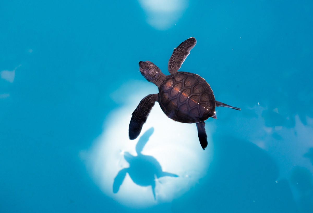 繁殖期(2月頃から)には二見湾内でもアチラコチラで水面に浮かぶカメ達が見られ、産卵期(6月~8月はじめくらい)に入ると海で見られるカメ達の他、父島各所のビーチに多くの母ガメが上がって来て産卵を行います。町中の大村海岸も母カメ達の産卵場所の一つで、夜歩いていると産卵に上がってきたウミガメ達に出会うこともあるんです。ただ、産卵のために上がってくる母ガメ達、夜の暗いはずの海岸にライトが照らされているだけでそれを嫌がって海に帰ってしまいます。特にウミガメ達の産卵時期には、夜の海岸を歩く際に使うライトで照らすのはご自身の足元だけにして頂き、前方にウミガメがいないかどうかを照らして探すのような事はしないであげてくださいね。小笠原の海岸はウミガメ達の大切な命をつなぐ場所なのです。