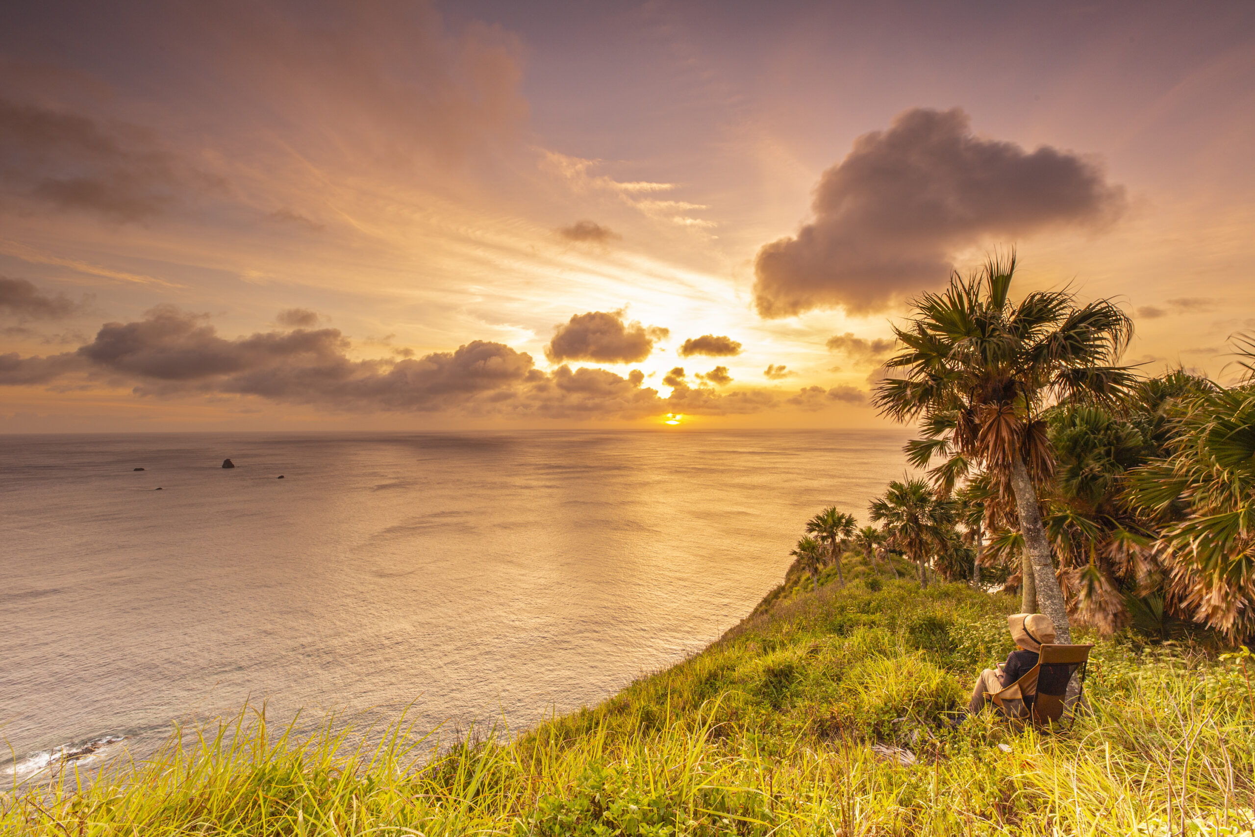 どの時間に行っても美しい場所ですが、特に、島を取り巻くボニンブルー全開になる午前中に訪れてもらうのと、その開放的な場所で身も心も解き放たれて眺める夕陽の時間がおすすめ。