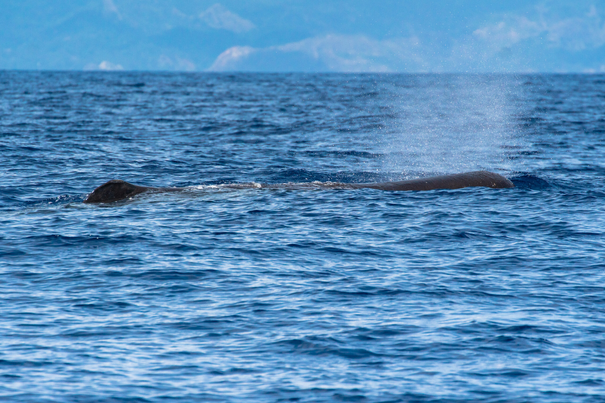 広い海でマッコウクジラを探す時に目印となるのがブローと呼ばれる呼気。ザトウクジラやイルカ達と同じく哺乳類であるマッコウクジラも勿論肺で呼吸をする生き物です。長い間水中で息を止めていたクジラたちが水面に上がり息を吐き出すと肺で温められた空気が外気と触れることで白く霧散します。マッコウクジラの場合はこのブローが斜め45度の角度で上がります。ちなみにザトウクジラはほぼ真上に上がるブローです。そんな斜め45度のブローが上がらないかどうか水平線に目を凝らしてみましょう。